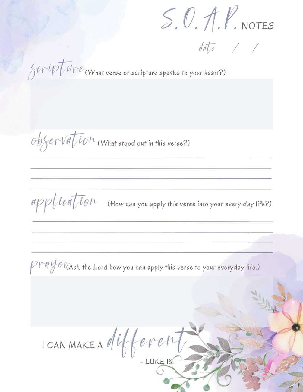 – Bible study sections using the SOAP method