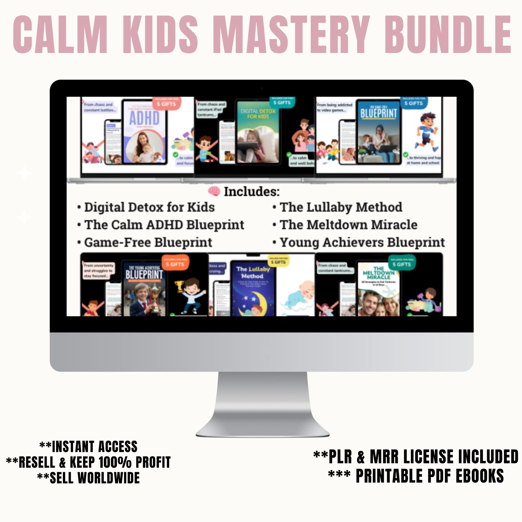 Help parents nurture calm, confident kids with the Calm Kids Mastery Bundle — 6 editable eBooks with PLR & MRR rights. Buy each for $7 or the full bundle for $30.