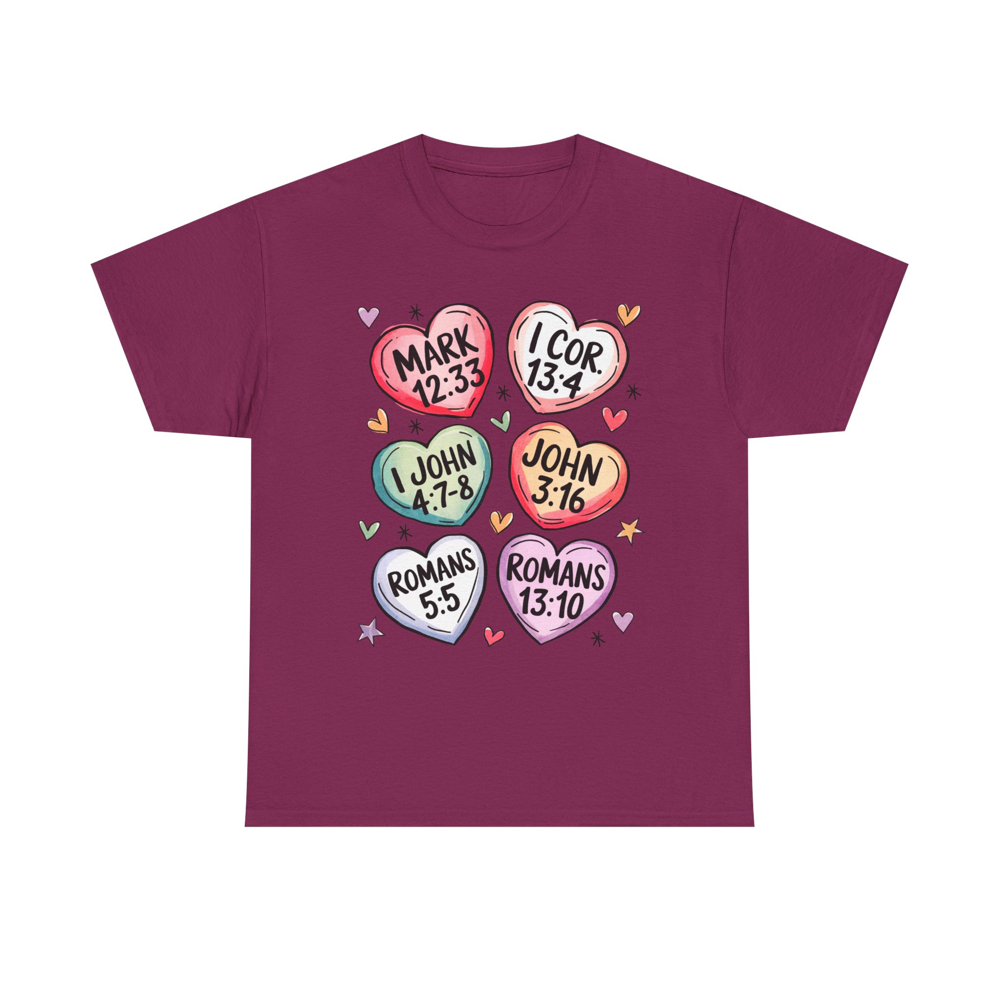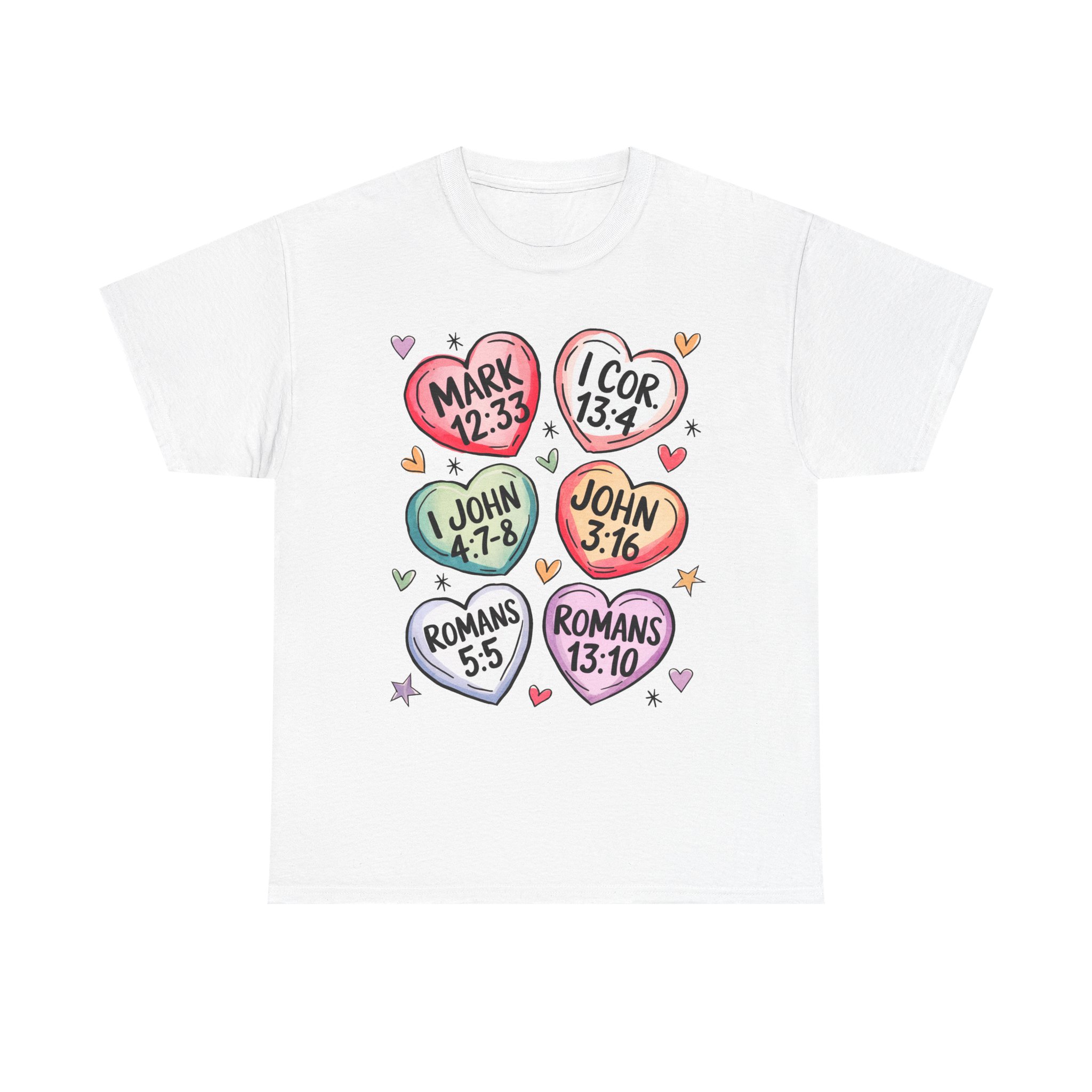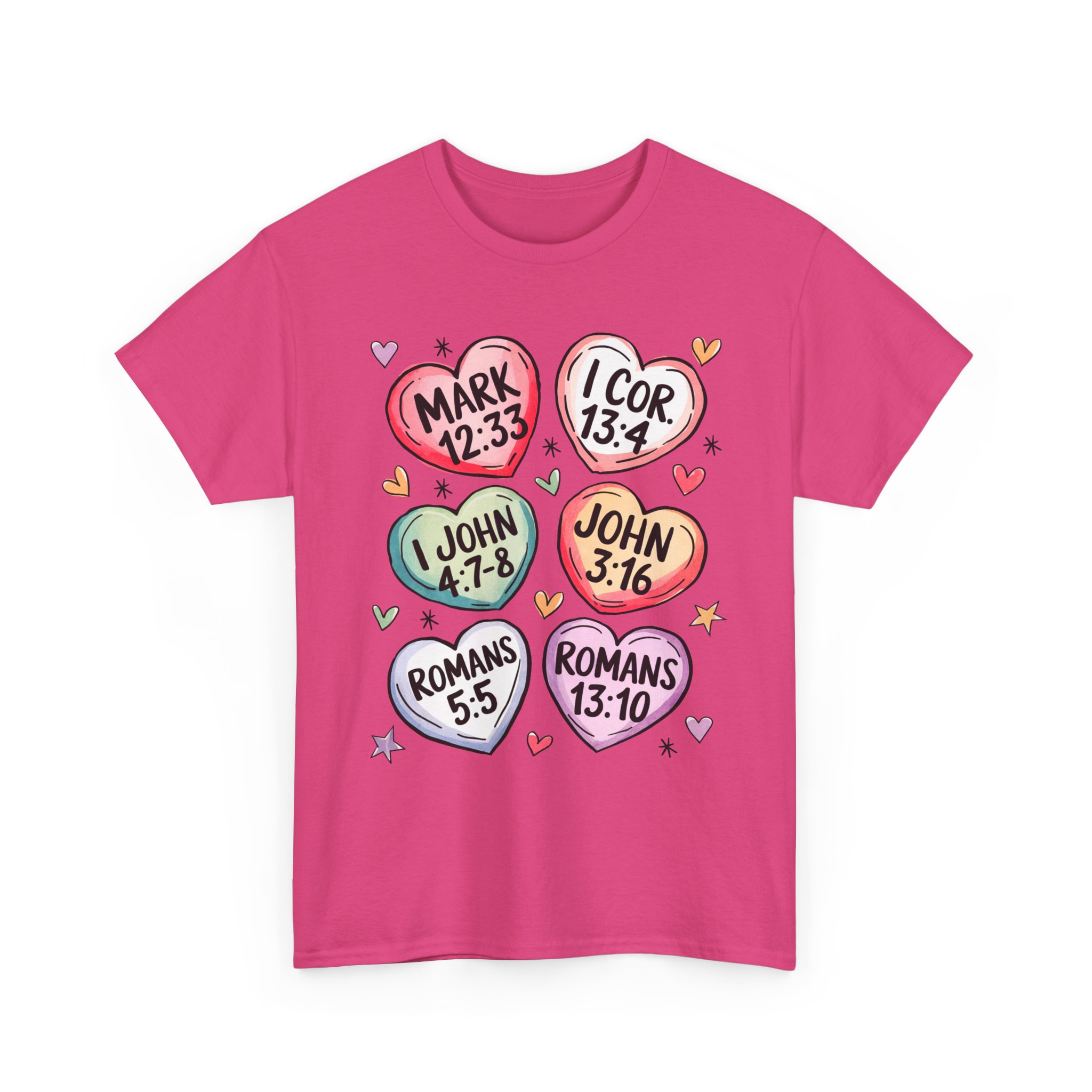 Pastel Christian Scripture Hearts T-Shirt featuring verses from John 3:16, Romans 5:5, and Mark 12:33. This t-shirt exudes a calming and spiritual vibe, perfect for those seeking faith-inspired clothing. Ideal for Christians looking to express their beliefs through fashion. Relevant for Easter, Christmas, church services, and daily wear.