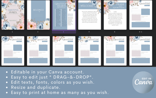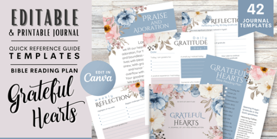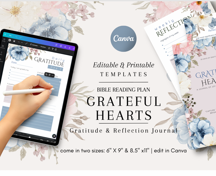 A beautifully designed digital journal to help you reflect, pray, and give thanks. Includes editable pages, daily prompts, scripture reflections, and bonus verse cards—perfect for quiet time or devotionals.