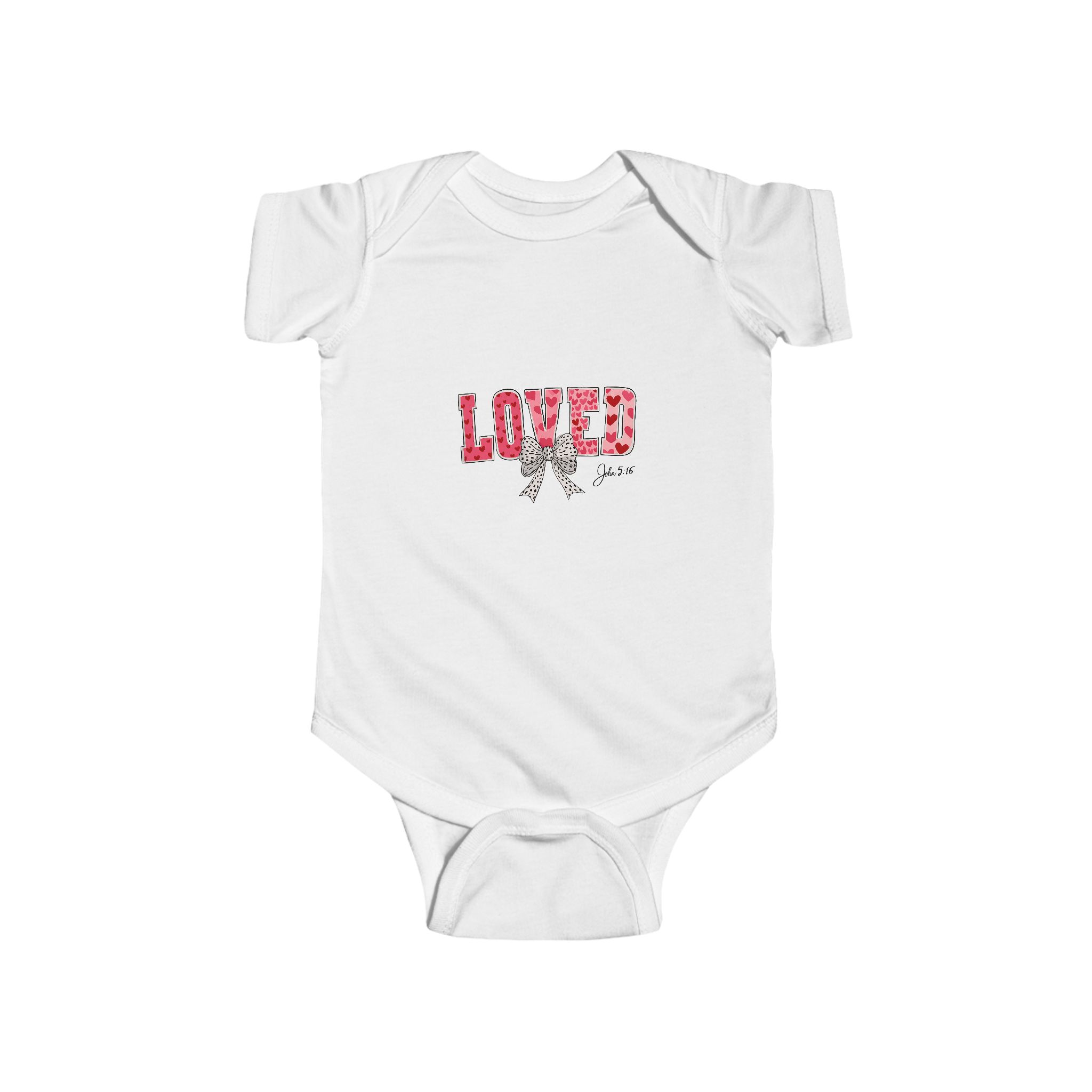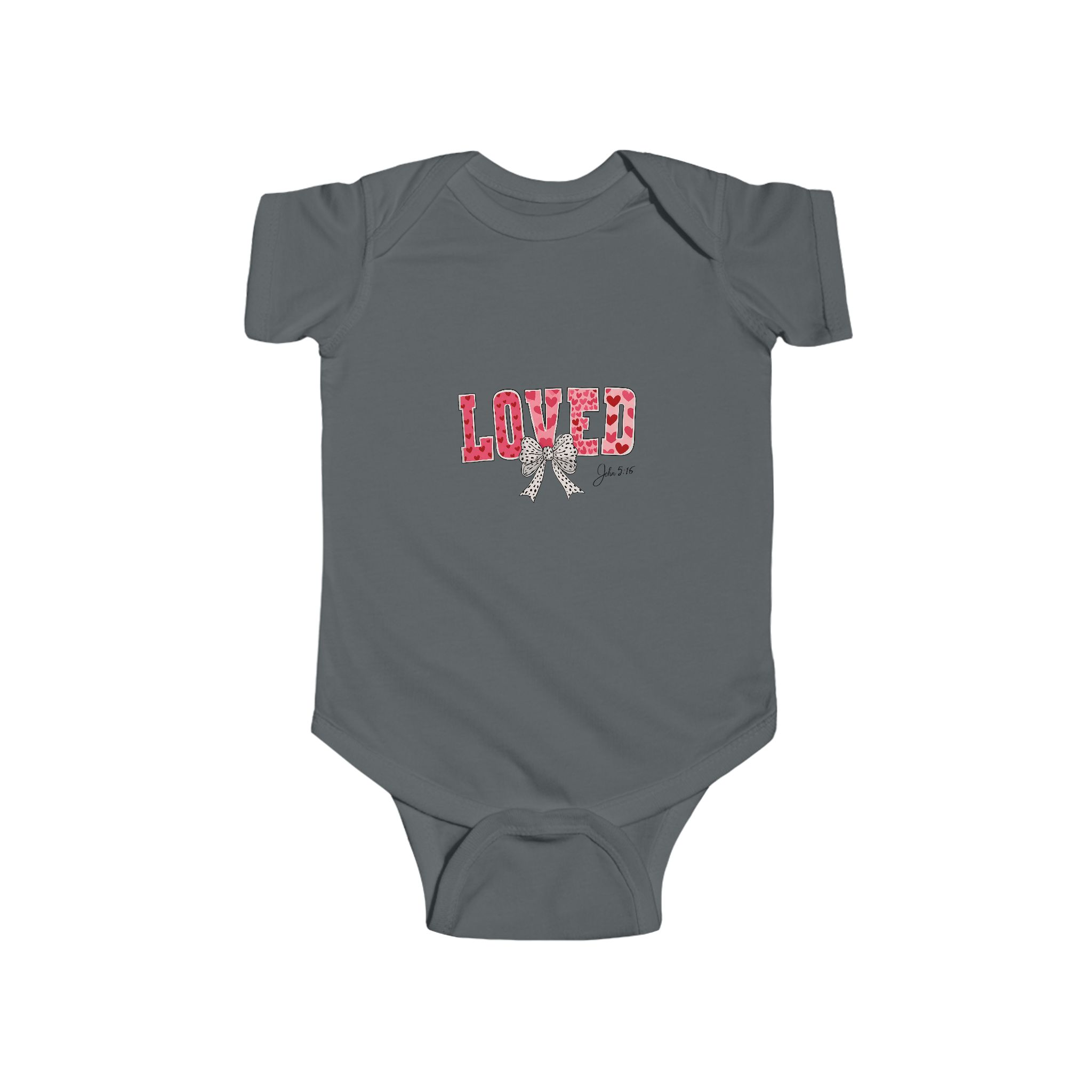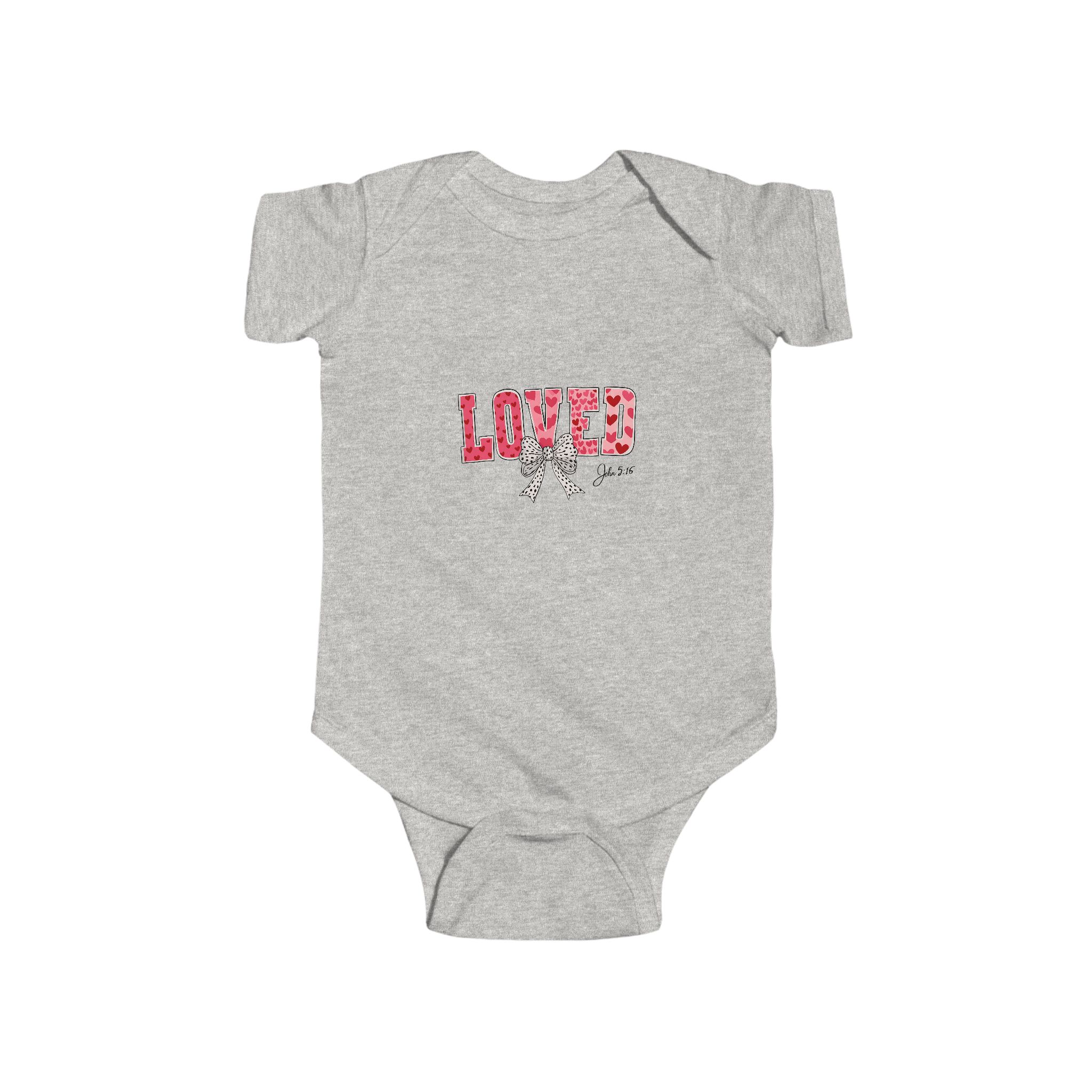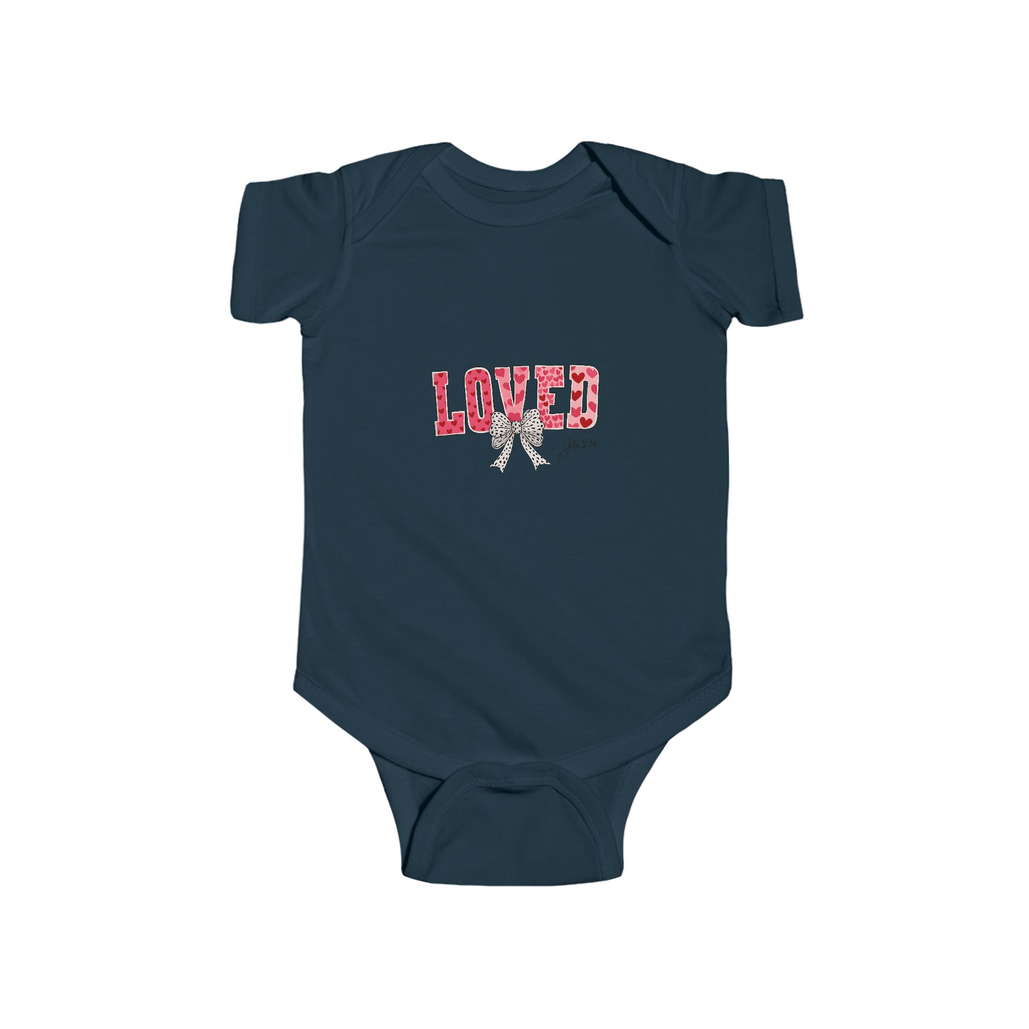 A soft, lightweight infant bodysuit that reads “LOVED” in a gentle, floral-inspired print — a quiet reminder wrapped around a baby’s chest. The fabric feels smooth against tiny skin, with ribbed binding at the neck and arm openings for easy movement and comfortable dressing. Side seams give the little garment structure so it keeps its shape through washes. Practical snaps at the crotch make diaper changes simple and quick. Breathable and light, this onesie settles into everyday moments — naps, cuddles, stroller rides — and carries a warm, tender message with subtle style.